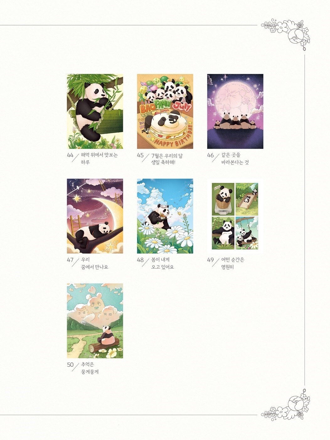 Это первая книга арт-команды Kami25, которая разработала персонажей семьи Бао вместе с Everland. В этой книге собраны счастливые моменты их повседневной жизни, включая известного младенца панду Фубао. Фубао играет с игрушкой, созданной его дедушкой, Айбао летает на самолете с красивой дочкой, а также эпизоды с воронами и Лубао, которые влекут за собой множество милых ситуаций. В книге представлено 50 очаровательных иллюстраций, наполненных теплотой и фантазией, которые будут настоящим подарком для поклонников семьи Бао.