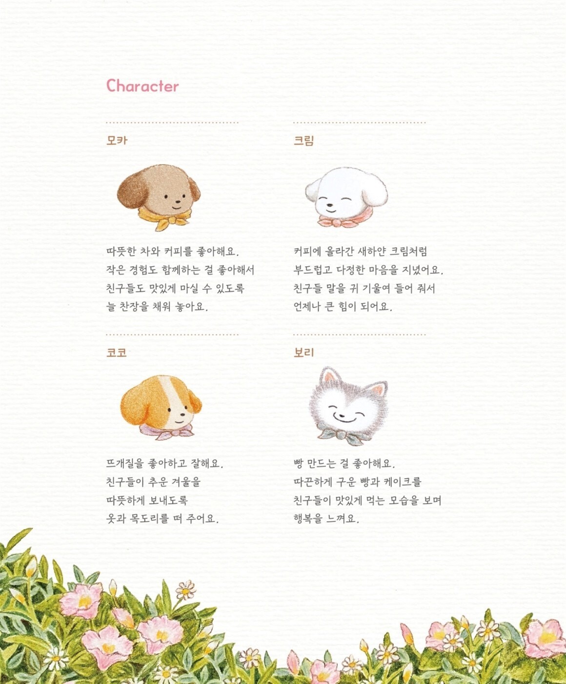 В деревне Стелла, где особенно ярко светят звезды, живут шесть дружных друзей: Мокка, Крим, Коко, Бори, Лулу и Юльму. Эти милые щенки живут под одной крышей, наслаждаются чаем и кофе, пекут хлеб, которым делятся друг с другом, ухаживают за садом и проводят свои счастливые дни. Разукрашивая истории, соответствующие временам года, вы постепенно влюбитесь в очарование этих замечательных друзей.