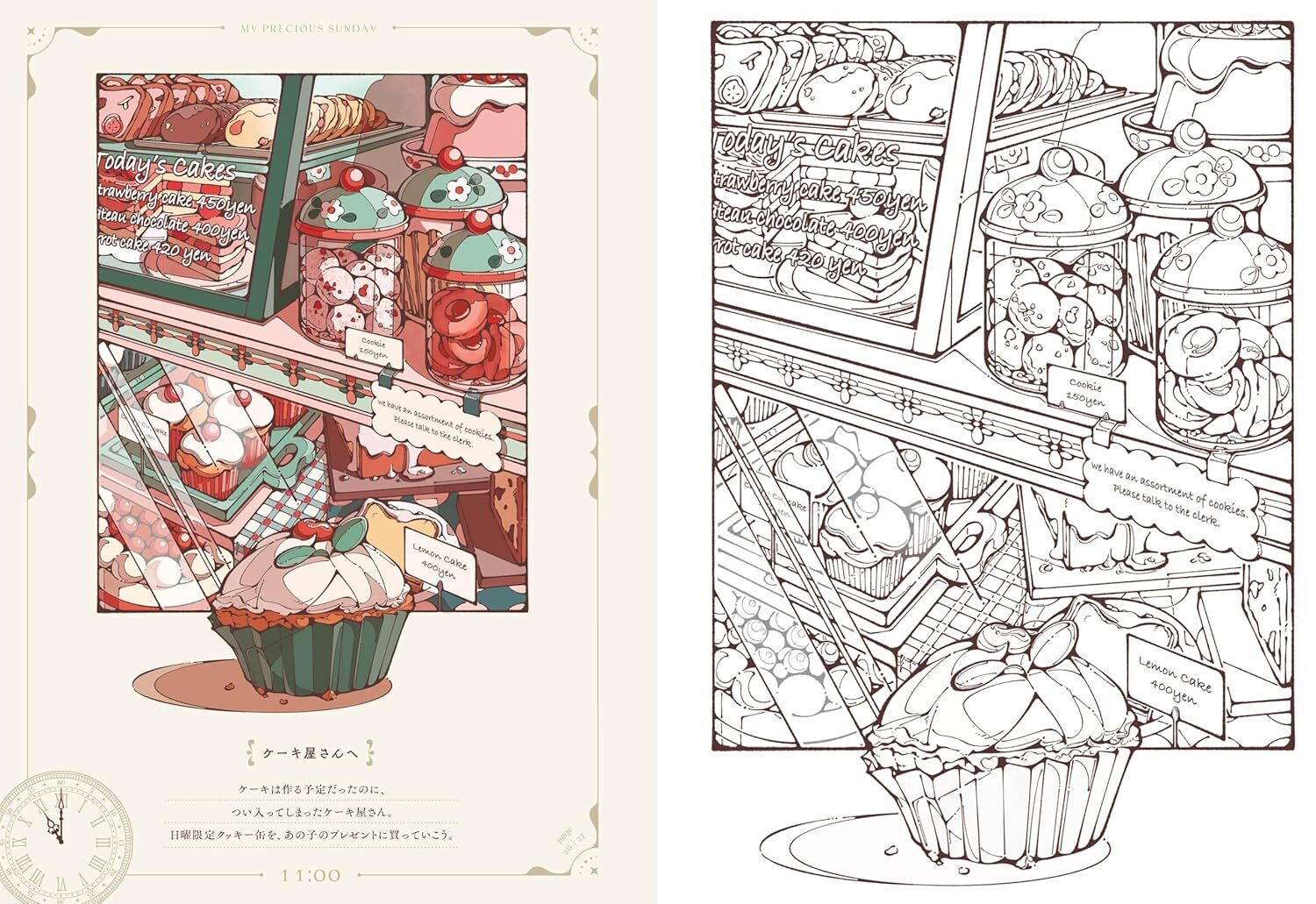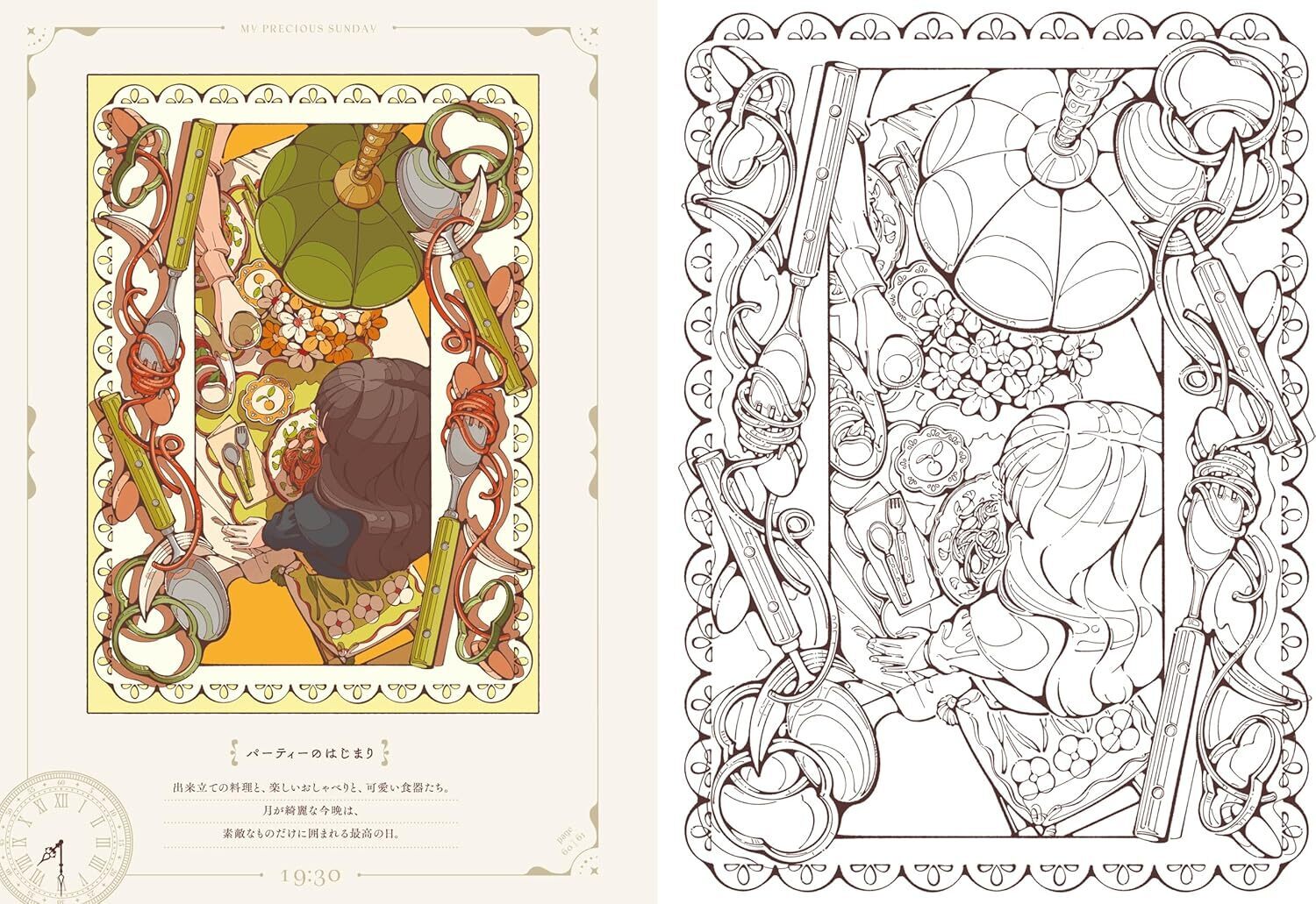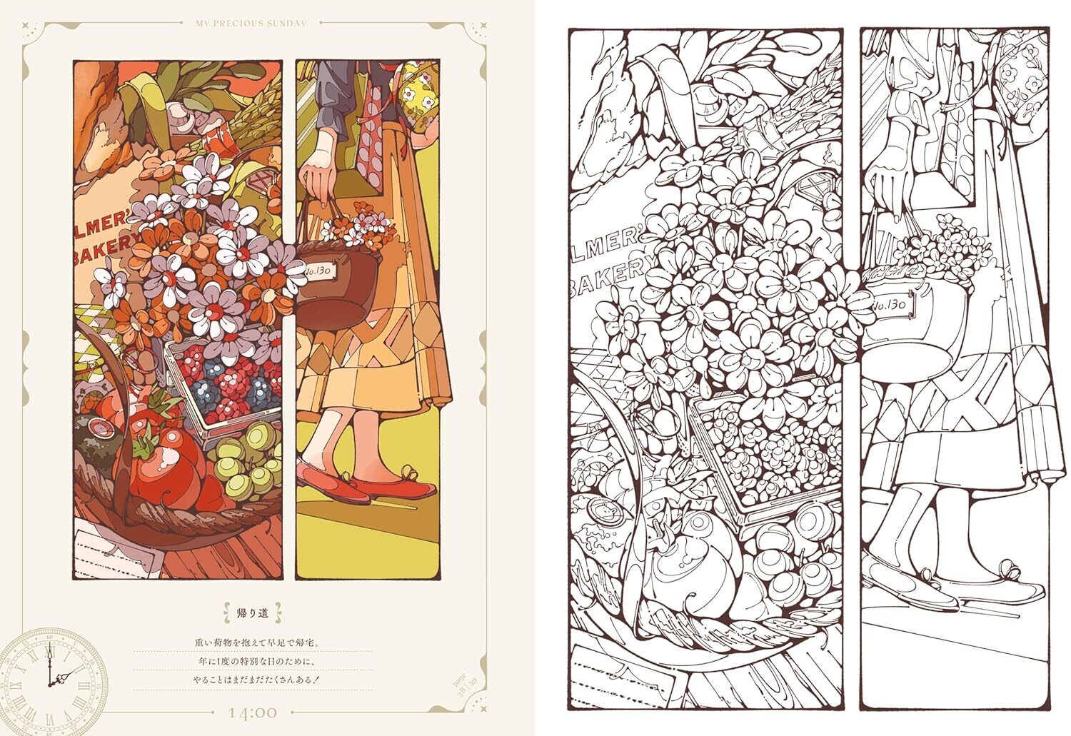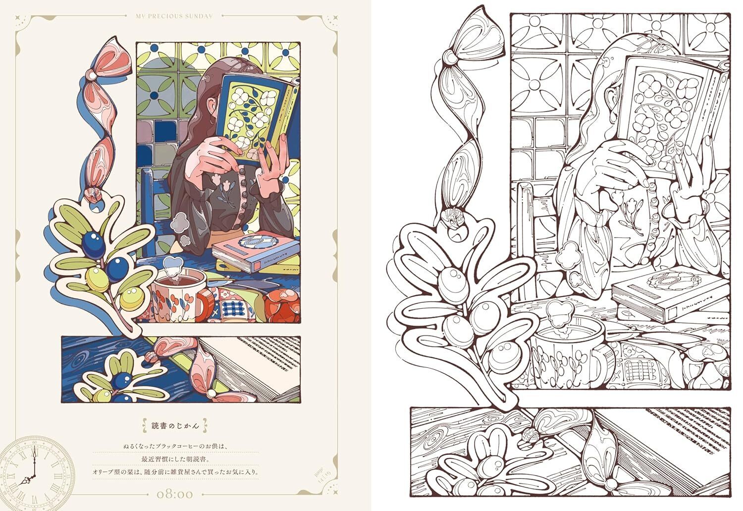 Этот раскрас создан известным иллюстратором Хинако, чьи ретропоп-иллюстрации в стиле «девушки» пользуются популярностью. В книге рассказывается оригинальная история о «особенном воскресенье», которое проводят я и моя подруга, родившиеся в один и тот же день весной.