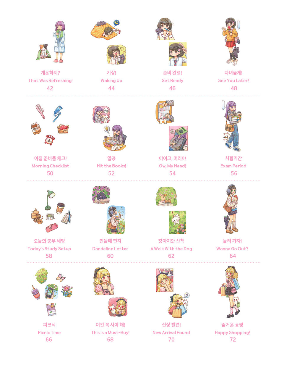 В этой книге собраны истории о тёплом и душевном дне девочки и её кота: уютные моменты дома, небольшие сцены подготовки к новому дню, минуты отдыха и перекуса, а также радостные прогулки.